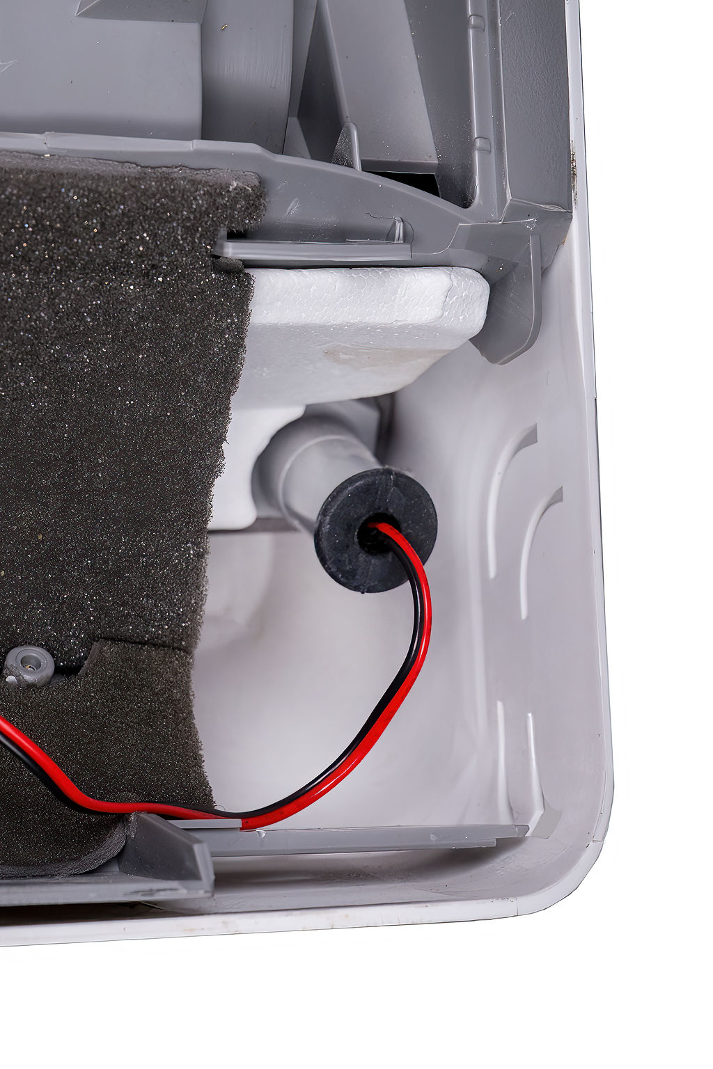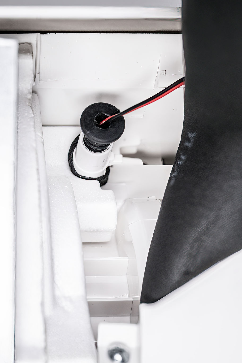 Remove the rubber plug from the unused drain outlet and insert the rubber sensor probe into it, ensuring that it is securely seated to provide a leak-free connection.
